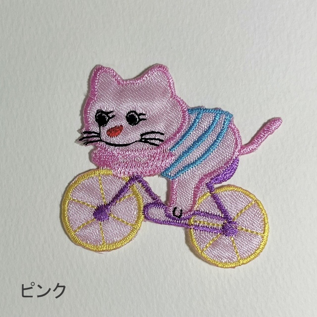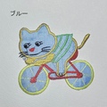 ロードバイクで颯爽と走る猫さんのアップリケ。よく見るとハンドルが無いようですが、のんきに走っています。