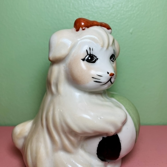 見ていると力が抜けてしまいそうになるほど愛らしい、80sデッドストックの貯金箱。もの言いたげな表情でこちらをジィッと見つめてくれます。貴方の毎日に寄り添い、優しく癒してくれそうなほんわか系のわんこですが、実は中国陶磁史において名高い「陝西省の耀州窯」で作られた由緒正しい子。よく見ると毛並みは艶やかで美しく、全体のフォルムもどことなく洗練されているような。底蓋は付いていないので、本気でお金を貯めたい方にはあまりオススメはできません。