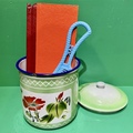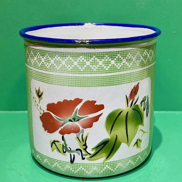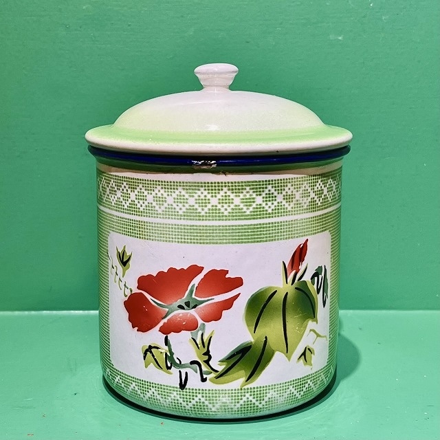夢見るような甘くて優しい印象のふた付き琺瑯カップ。こちらは1970年代に「久新ブランド」で生産されたもので、直径13cmの特大サイズ。ホワイトのボディにグリーンの糸でクロスステッチ刺繍が施されたような珍しいデザインで、赤いお花は朝顔でしょうか。