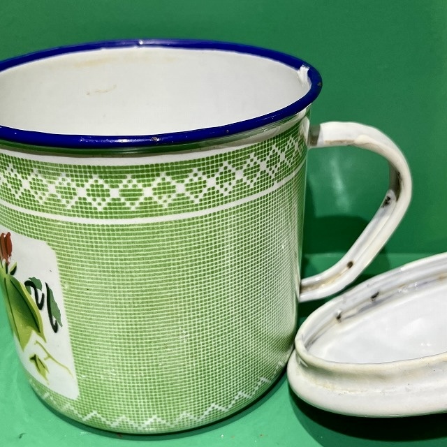 70sヴィンテージ琺瑯/ふた付きビッグカップ/グリーン[horo-384]