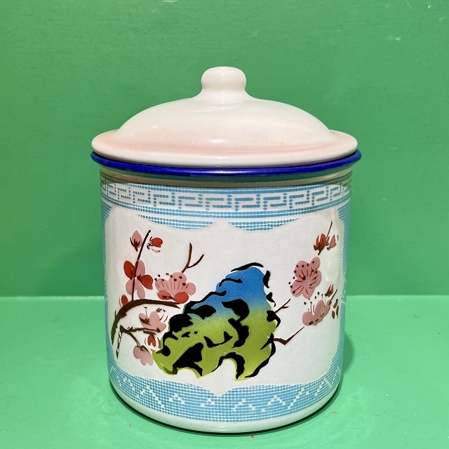 夢見るような甘くて優しい印象のふた付き琺瑯カップ。こちらは1970年代に「ダムブランド」で生産されたもので、直径13cmの特大サイズ。ホワイトのボディにブルーの糸でクロスステッチ刺繍が施されたような珍しいデザインで、絵柄は梅の木と石。定番のモチーフですね。