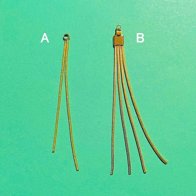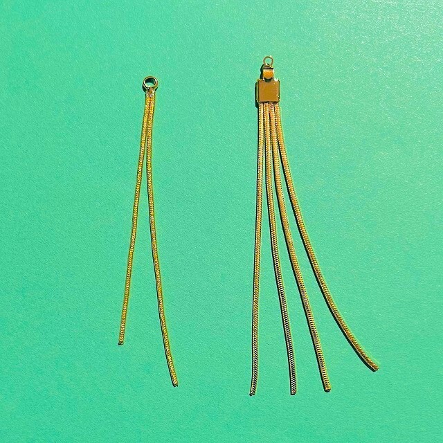 アクリル製のランタンビーズとメタルフリンジを組み合わせてピアスにしてみました。メタル製のフリンジパーツは2本のモノと4本(右)のモノの2種類。4本の方がゴージャス感強めです。チャイナ風以外のパーツにもどうぞ。一点の価格です。