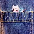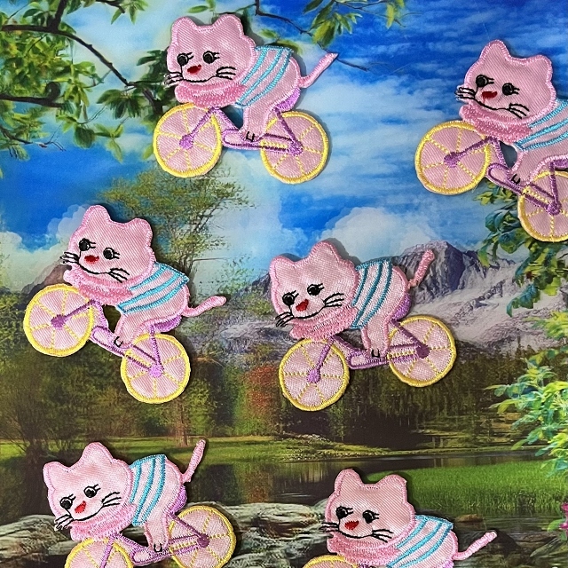 ロードバイクで颯爽と走る猫さんのアップリケ。よく見るとハンドルが無いようですが、のんきに走っています。