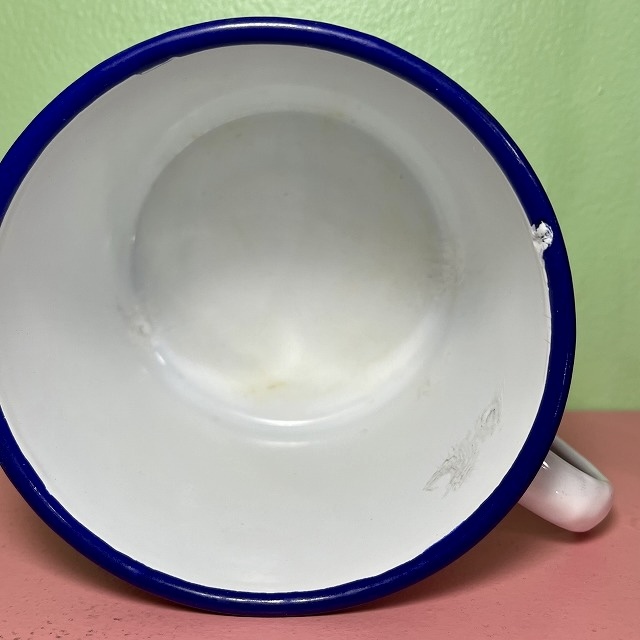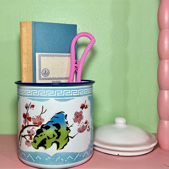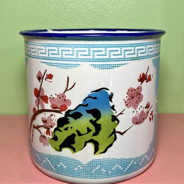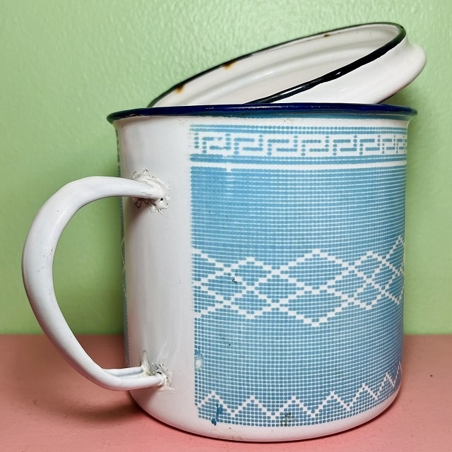夢見るような甘くて優しい印象のふた付き琺瑯カップ。こちらは1970年代に「ダムブランド」で生産されたもので、直径13cmの特大サイズ。ホワイトのボディにブルーの糸でクロスステッチ刺繍が施されたような珍しいデザインで、絵柄は梅の木と石。定番のモチーフですね。