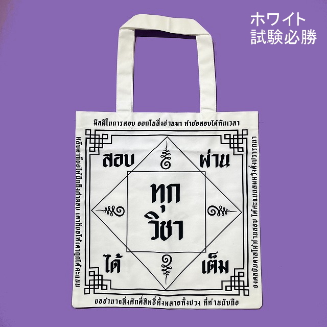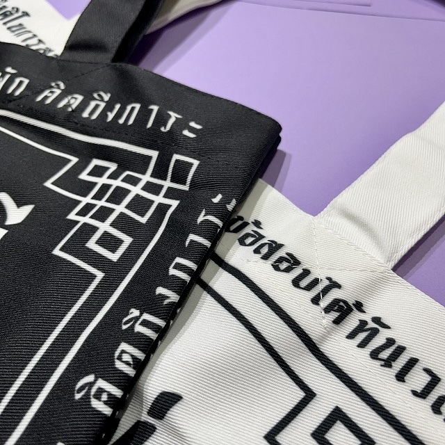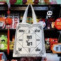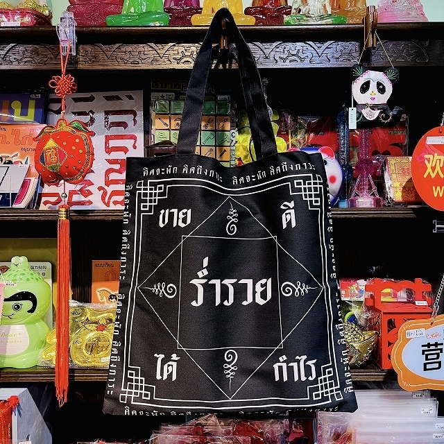 レトロなフォントのタイ文字と魔術を連想させるデザインが不思議なムードを漂わせるトートバッグ。さてさて、何と書いてあるのでしょうか。ブラックは「リッチ、富豪」、ホワイトは「試験必勝」。どちらもストレートな表現が潔いですね。神秘的な雰囲気を演出しつつ、こっそり運を引き寄せちゃいましょう。