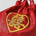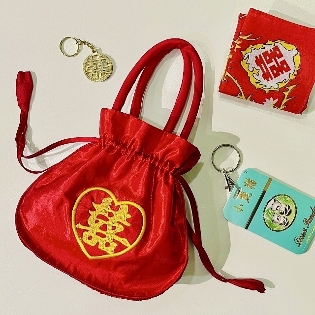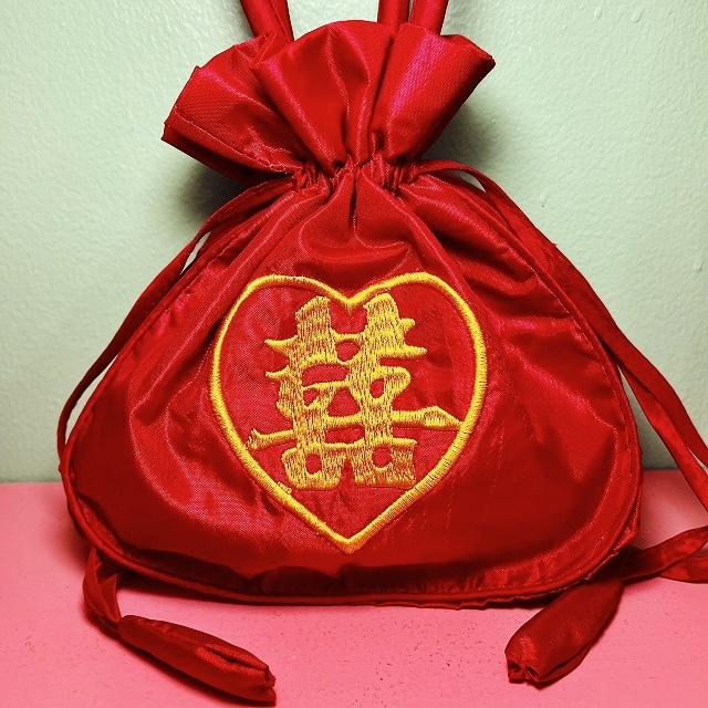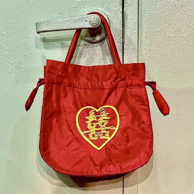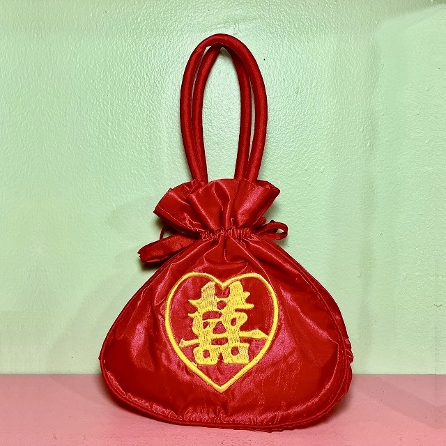 真っ赤なサテン地にダブルハピネスの刺繍が映える、店舗でも人気の巾着バッグ。ポーチとしてもご使用になれます。