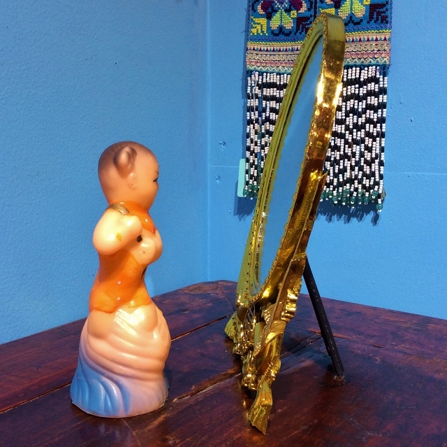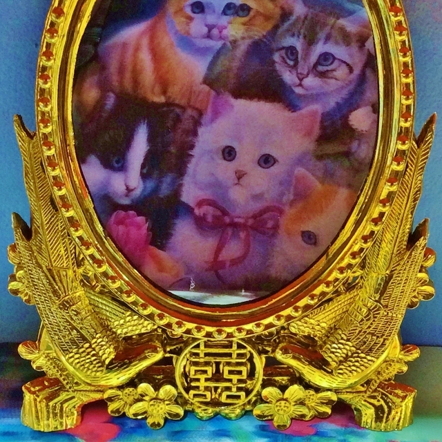 まばゆいばかりに輝くイエローゴールドの卓上ミラー。「喜びを告げる鳥」とされるカササギ2羽が正にダブルハピネスをくわえて運んでいるという、何ともおめでたいデザインです。ゴールドのフレーム部分は重量感のある金属製のように見えて、実はプラスチック製。90年代デッドストックならではのキッチュで楽しい一品です。