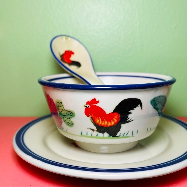 香港や広東、東南アジアでは定番のおんどり柄の食器セット。絵柄のおんどりは勤勉や繁栄を意味し、サイドの牡丹の花は富貴、バナナの葉は長寿を象徴しているとのこと。つまり吉祥モチーフ全部載せです。既に当店でもお馴染みのおんどりアイテムですが、今回の陶磁器食器はボウル、お皿、れんげの三点セット。アジアンスイーツはもちろん、中華粥やスープの器にもどうぞ。プレートは単品でもご使用になれます